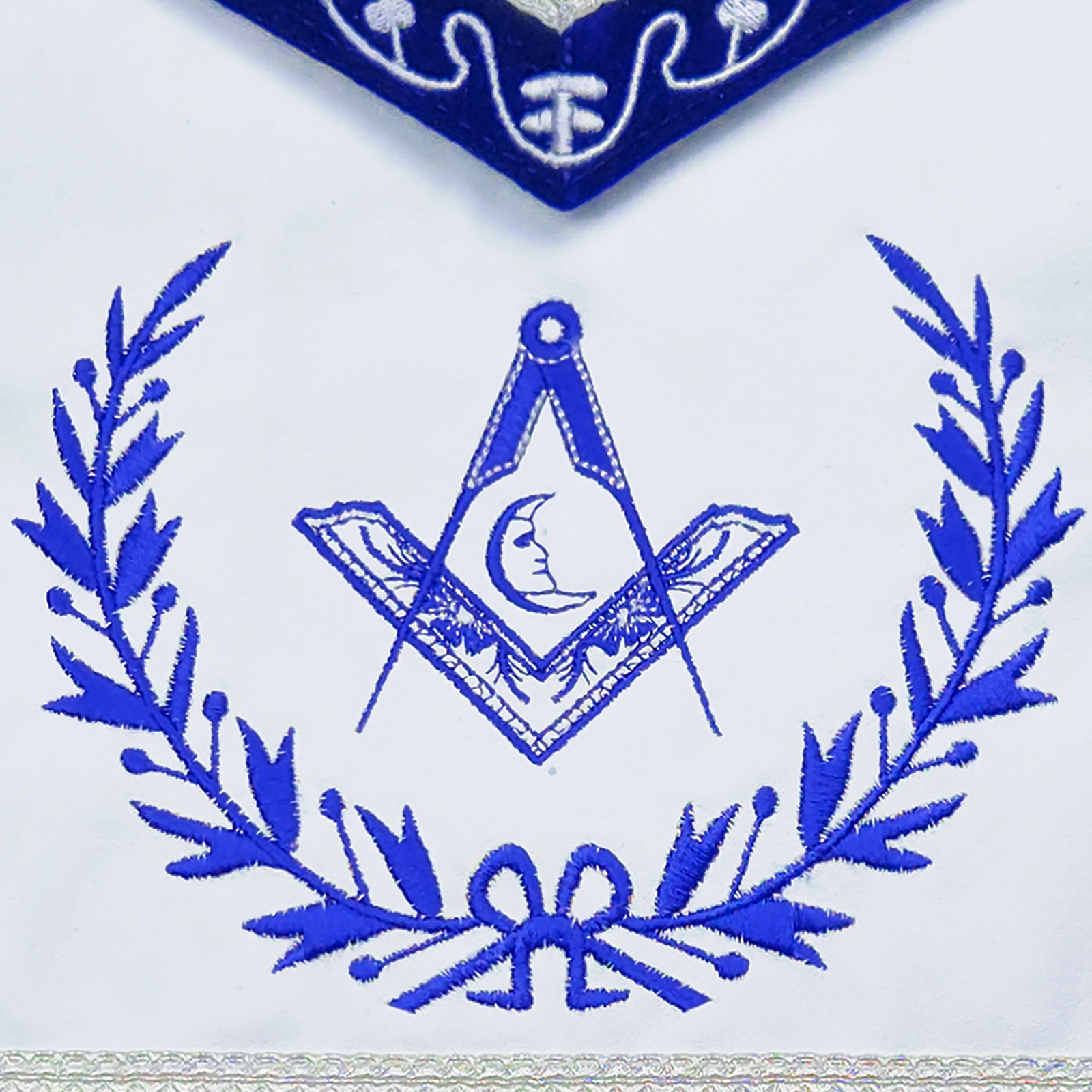 Each apron is meticulously machine embroidered, with the wreath and square symbolizing the Junior Deacon’s responsibility to maintain order and uphold the lodge’s integrity. The white embroidered detailing on the deep blue velvet border adds refinement and a ceremonial presence, making this apron an ideal choice for Masonic officers.