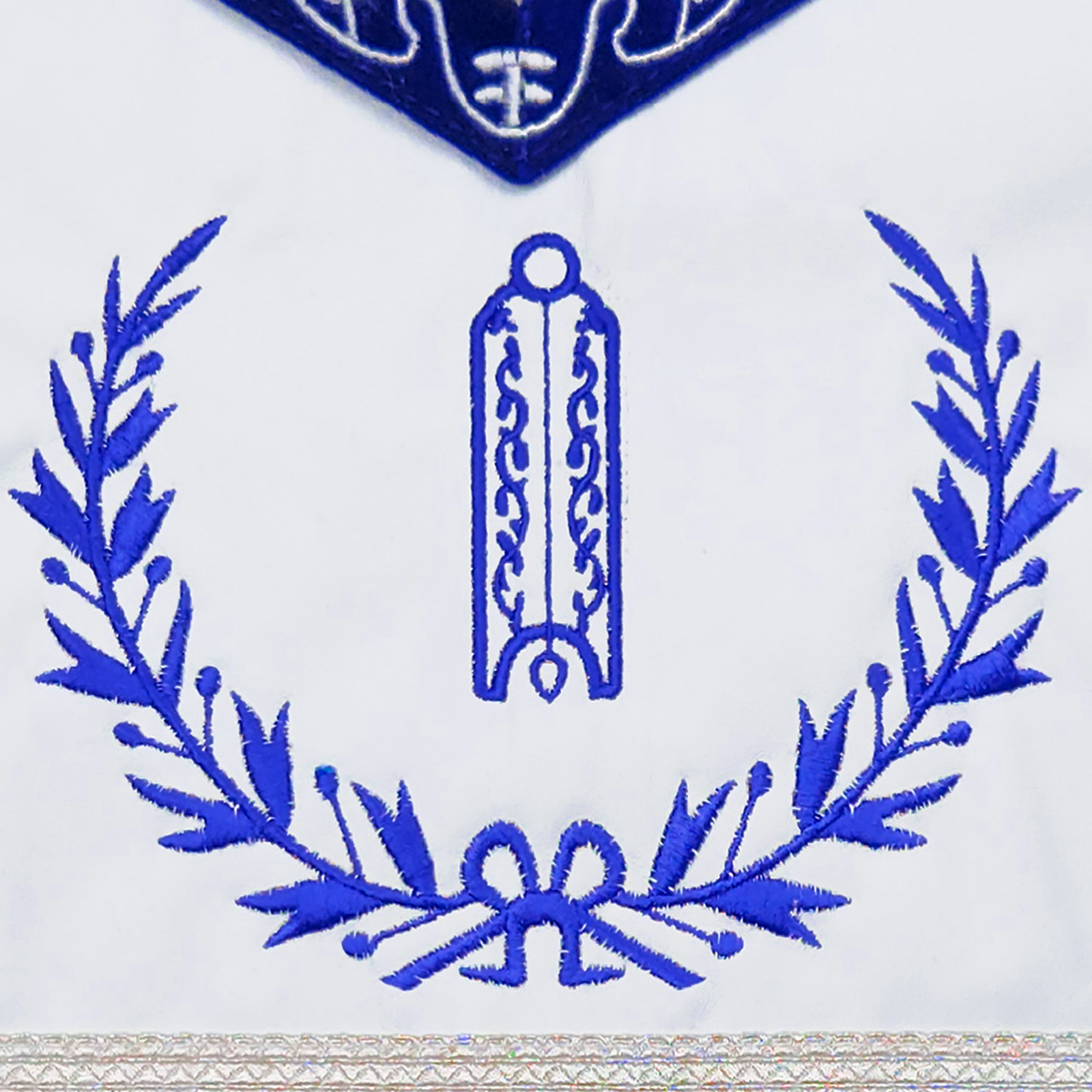 Representing harmony, balance, and vigilance, the Blue Lodge Junior Warden Apron is a distinguished piece of Masonic officer regalia, designed for those who supervise the lodge at refreshment and uphold order and discipline. Crafted with exceptional precision, this apron features intricate machine embroidery, including a beautifully detailed wreath and square, signifying unity, responsibility, and the Junior Warden’s vital role in Masonic tradition. The deep blue velvet border, adorned with white embroidered detailing, adds a regal touch, ensuring an impressive and dignified presence in lodge meetings and ceremonial functions.