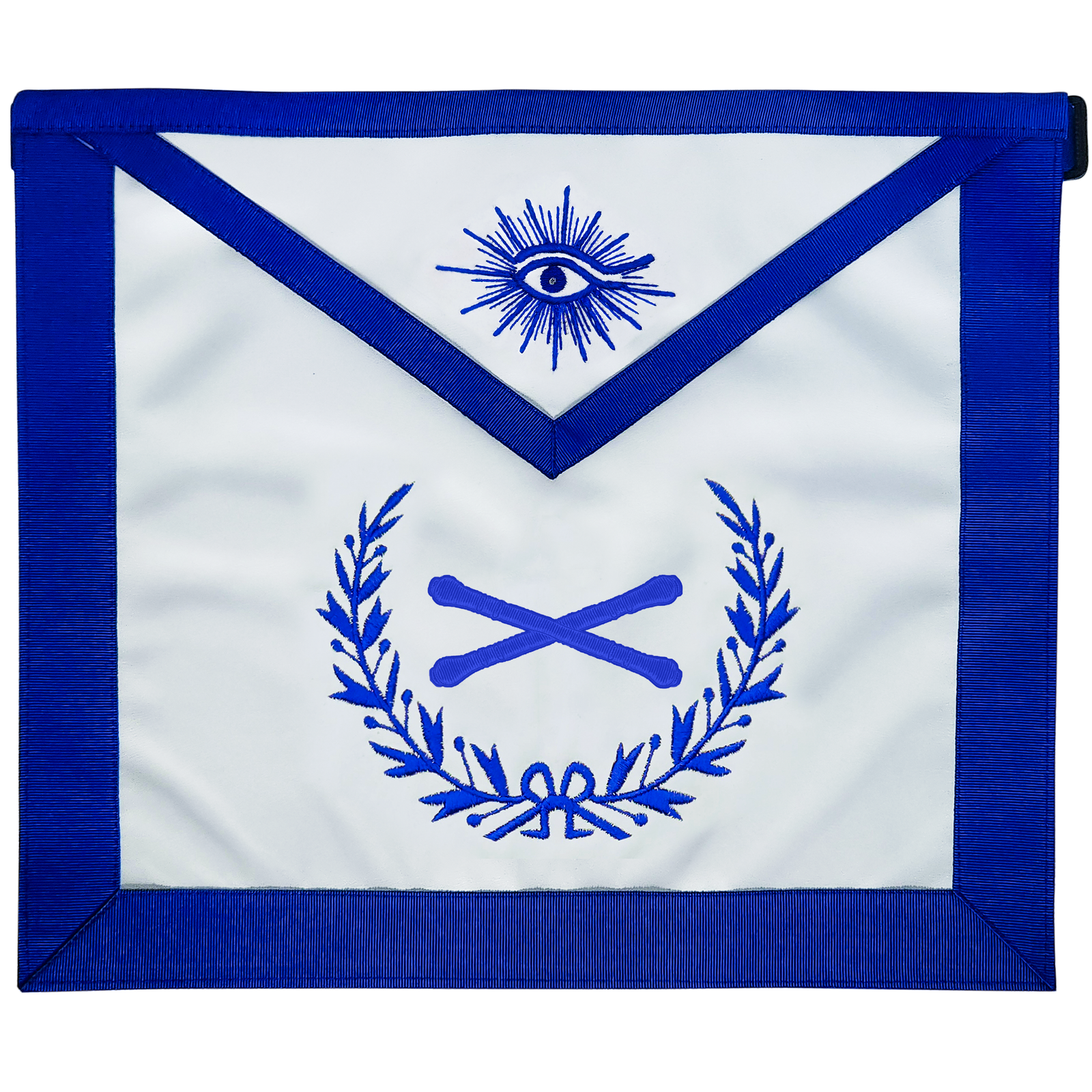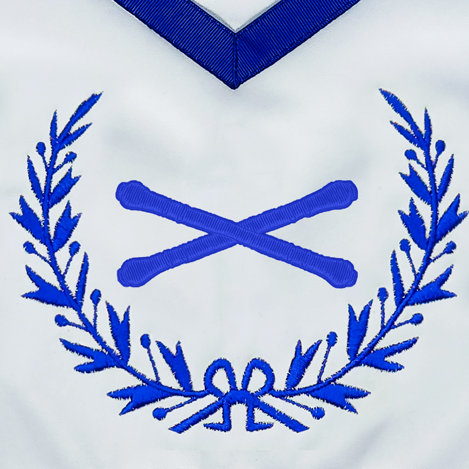 The crossed batons emblem is machine embroidered with careful attention to proportion and stitch quality, resulting in a crisp and professional presentation that aligns with Blue Lodge standards.
