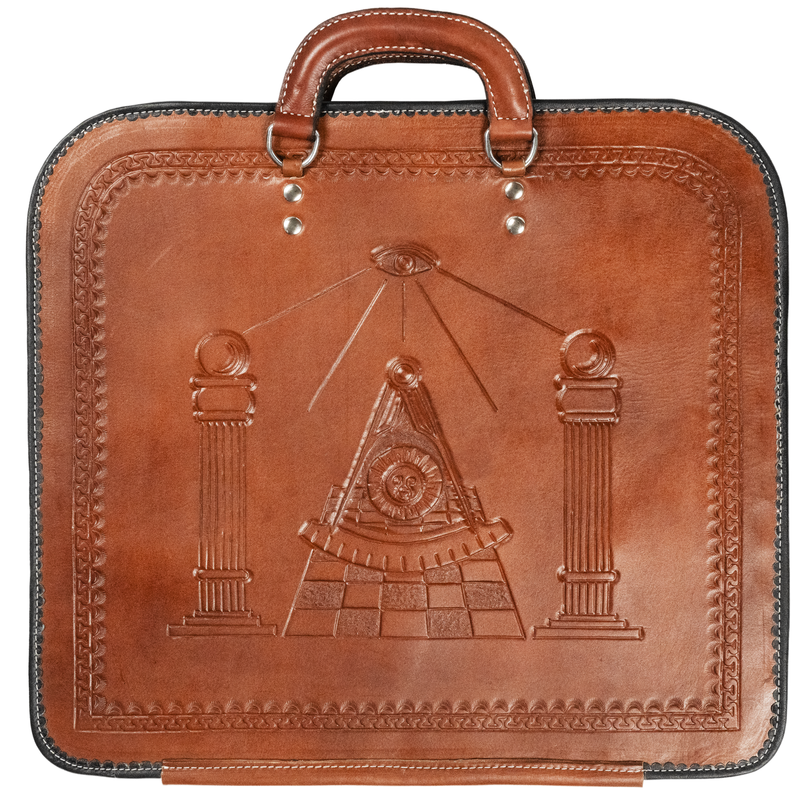 Every detail of this apron case is a tribute to the profound allegories of Freemasonry. The hand-tooled front panel showcases deeply embossed Masonic symbols, meticulously crafted to inspire and uphold the Masonic journey: