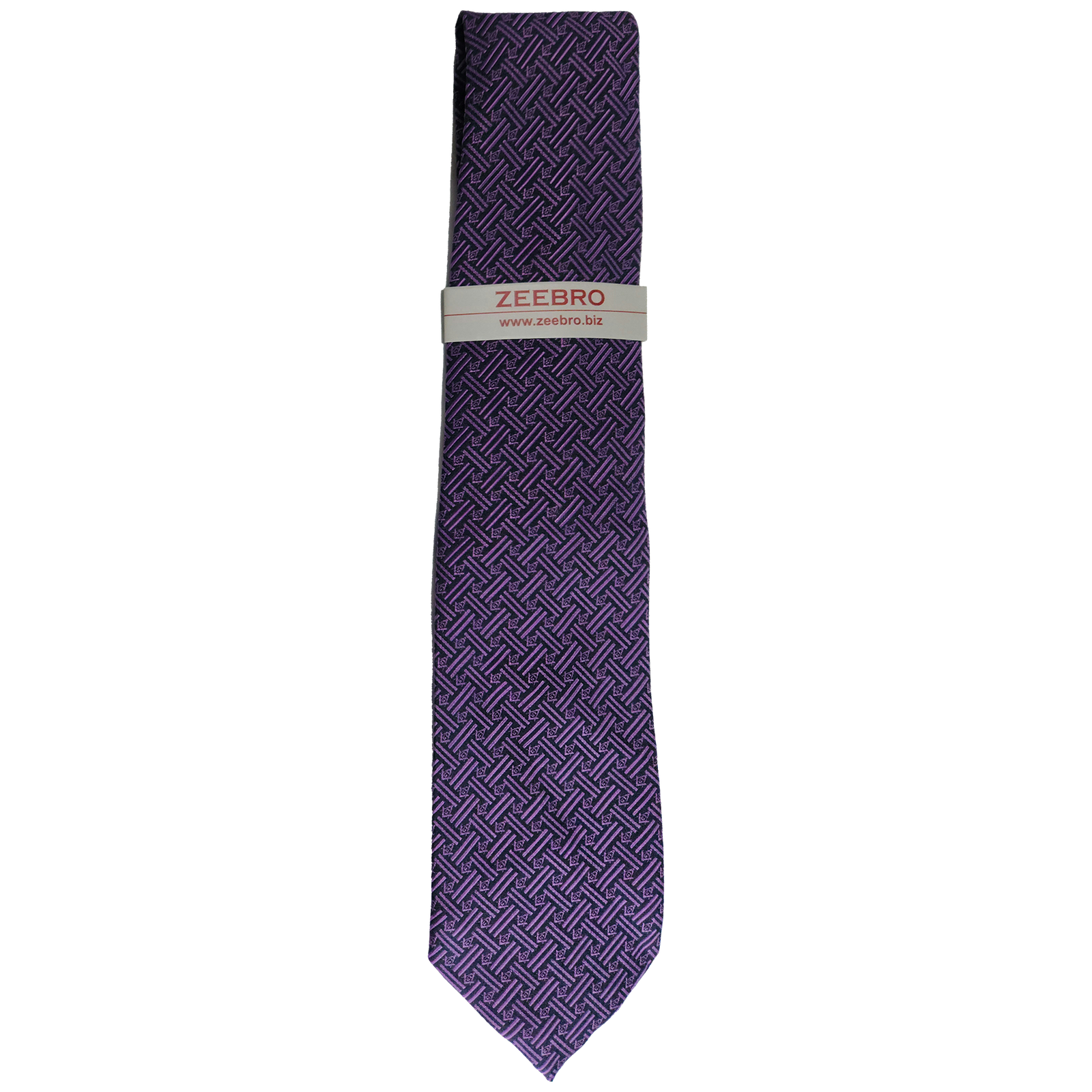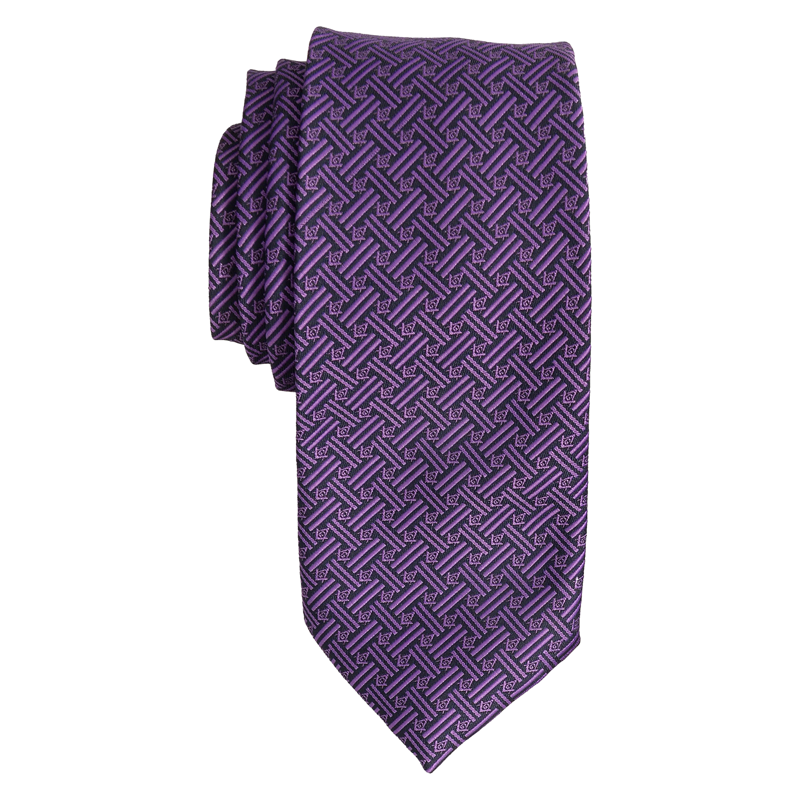 Varying purple tones give depth and dimension to the pattern; the interplay of light and shadow across the weave enhances the tie’s three-dimensional texture and lends a refined, ceremonial feel.